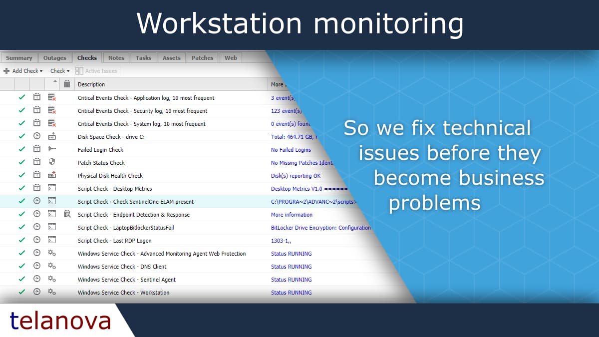Workstation monitoring tells us when something is wrong, or about to go wrong with a particular workstation. We tailor the precise monitoring checks to each customers’ environment, but some common ones are: